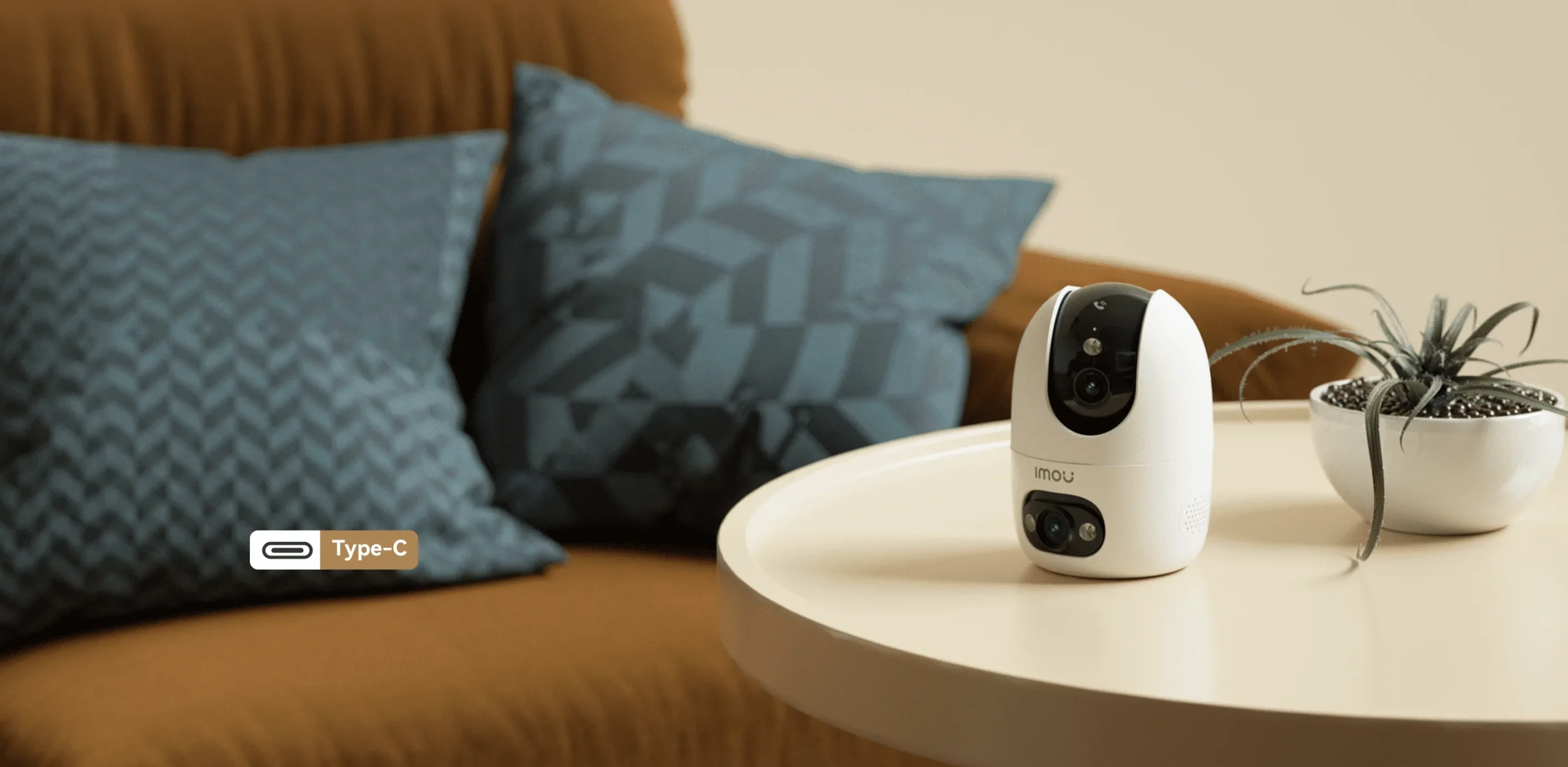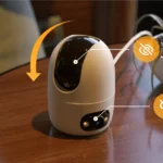Indoor Wi-Fi security camera featuring two lenses for simultaneous monitoring of two different zone.